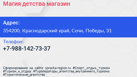 Магия детства, магазин по адресу 354200, Краснодарский край, Сочи, Победы, 31 в дальнейшем Организация, размещена в следующих категориях: