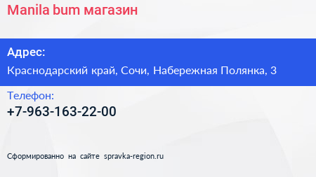 Manila bum, магазин по адресу Краснодарский край, Сочи, Набережная Полянка, 3 в дальнейшем Организация, размещена в следующих категориях: