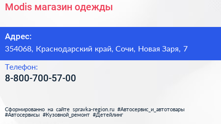 Modis, магазин одежды по адресу 354068, Краснодарский край, Сочи, Новая Заря, 7 в дальнейшем Организация, размещена в следующих категориях: