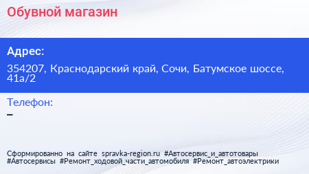 Обувной магазин по адресу 354207, Краснодарский край, Сочи, Батумское шоссе, 41а/2 в дальнейшем Организация, размещена в следующих категориях: