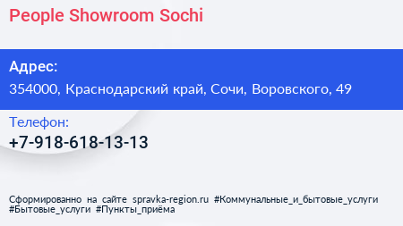 People Showroom Sochi по адресу 354000, Краснодарский край, Сочи, Воровского, 49 в дальнейшем Организация, размещена в следующих категориях:
