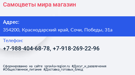 Самоцветы мира, магазин по адресу 354200, Краснодарский край, Сочи, Победы, 31а в дальнейшем Организация, размещена в следующих категориях: