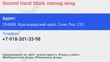 Second Hand & Stoсk, секонд-хенд по адресу 354000, Краснодарский край, Сочи, Роз, 113 в дальнейшем Организация, размещена в следующих категориях: