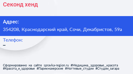 Секонд-хенд по адресу 354208, Краснодарский край, Сочи, Декабристов, 59а в дальнейшем Организация, размещена в следующих категориях: