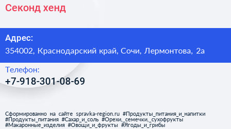 Секонд-хенд по адресу 354002, Краснодарский край, Сочи, Лермонтова, 2а в дальнейшем Организация, размещена в следующих категориях: