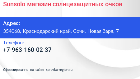 Sunsolo, магазин солнцезащитных очков по адресу 354068, Краснодарский край, Сочи, Новая Заря, 7 в дальнейшем Организация, размещена в следующих категориях: