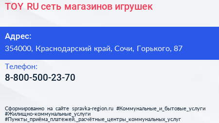 TOY.RU, сеть магазинов игрушек по адресу 354000, Краснодарский край, Сочи, Горького, 87 в дальнейшем Организация, размещена в следующих категориях: