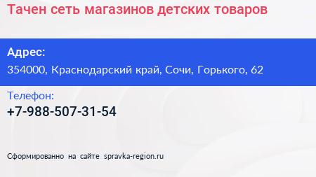 Тачен, сеть магазинов детских товаров по адресу 354000, Краснодарский край, Сочи, Горького, 62 в дальнейшем Организация, размещена в следующих категориях:
