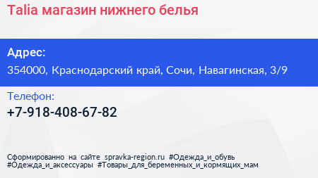 Talia, магазин нижнего белья по адресу 354000, Краснодарский край, Сочи, Навагинская, 3/9 в дальнейшем Организация, размещена в следующих категориях: