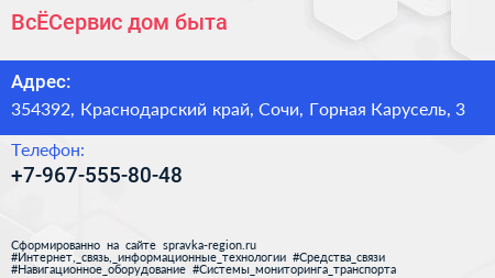ВсЁСервис, дом быта по адресу 354392, Краснодарский край, Сочи, Горная Карусель, 3 в дальнейшем Организация, размещена в следующих категориях: