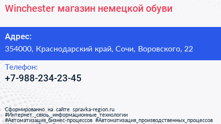 Winchester, магазин немецкой обуви по адресу 354000, Краснодарский край, Сочи, Воровского, 22 в дальнейшем Организация, размещена в следующих категориях: