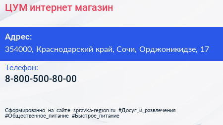 ЦУМ, интернет-магазин по адресу 354000, Краснодарский край, Сочи, Орджоникидзе, 17 в дальнейшем Организация, размещена в следующих категориях: