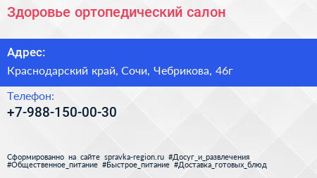 Здоровье, ортопедический салон по адресу Краснодарский край, Сочи, Чебрикова, 46г в дальнейшем Организация, размещена в следующих категориях: