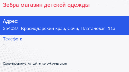 Зебра, магазин детской одежды по адресу 354037, Краснодарский край, Сочи, Платановая, 11а в дальнейшем Организация, размещена в следующих категориях: