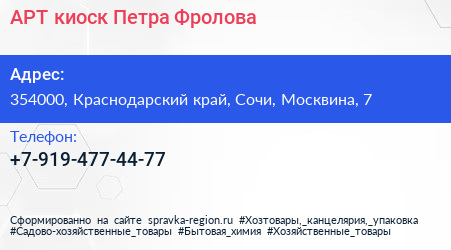 АРТ-киоск Петра Фролова по адресу 354000, Краснодарский край, Сочи, Москвина, 7 в дальнейшем Организация, размещена в следующих категориях:
