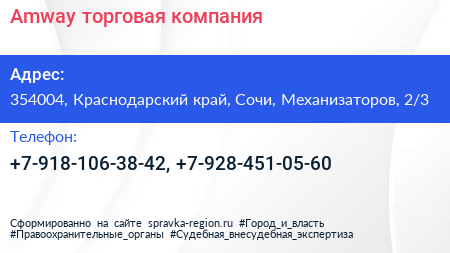 Amway, торговая компания по адресу 354004, Краснодарский край, Сочи, Механизаторов, 2/3 в дальнейшем Организация, размещена в следующих категориях: