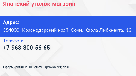 Японский уголок, магазин по адресу 354000, Краснодарский край, Сочи, Карла Либкнехта, 13 в дальнейшем Организация, размещена в следующих категориях: