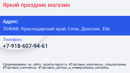 Яркий праздник, магазин по адресу 354068, Краснодарский край, Сочи, Донская, 10а в дальнейшем Организация, размещена в следующих категориях: