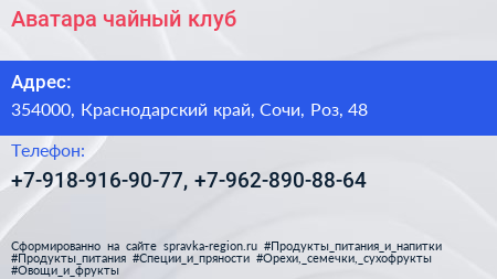Аватара, чайный клуб по адресу 354000, Краснодарский край, Сочи, Роз, 48 в дальнейшем Организация, размещена в следующих категориях: