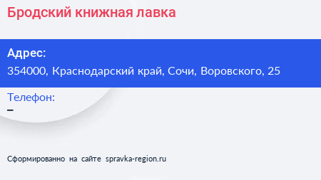 Бродский, книжная лавка по адресу 354000, Краснодарский край, Сочи, Воровского, 25 в дальнейшем Организация, размещена в следующих категориях: