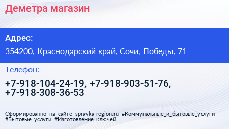 Деметра, магазин по адресу 354200, Краснодарский край, Сочи, Победы, 71 в дальнейшем Организация, размещена в следующих категориях: