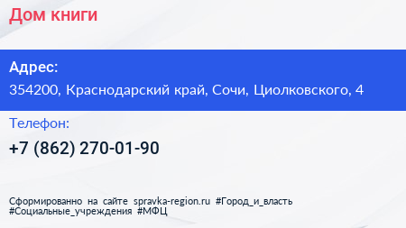 Дом книги по адресу 354200, Краснодарский край, Сочи, Циолковского, 4 в дальнейшем Организация, размещена в следующих категориях: