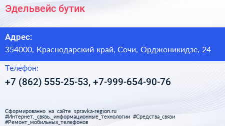 Эдельвейс, бутик по адресу 354000, Краснодарский край, Сочи, Орджоникидзе, 24 в дальнейшем Организация, размещена в следующих категориях: