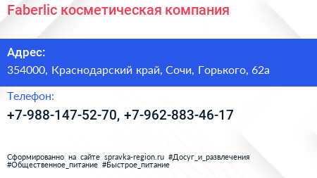 Faberlic, косметическая компания по адресу 354000, Краснодарский край, Сочи, Горького, 62а в дальнейшем Организация, размещена в следующих категориях: