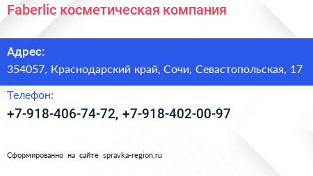 Faberlic, косметическая компания по адресу 354057, Краснодарский край, Сочи, Севастопольская, 17 в дальнейшем Организация, размещена в следующих категориях: