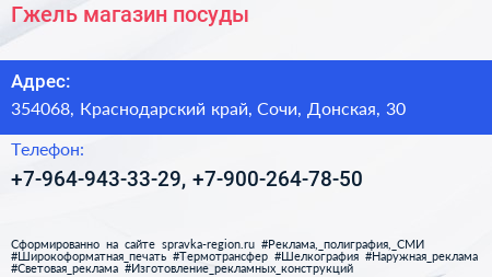 Гжель, магазин посуды по адресу 354068, Краснодарский край, Сочи, Донская, 30 в дальнейшем Организация, размещена в следующих категориях: