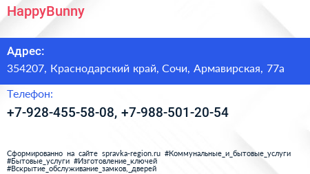 HappyBunny по адресу 354207, Краснодарский край, Сочи, Армавирская, 77а в дальнейшем Организация, размещена в следующих категориях: