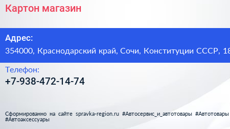 Картон, магазин по адресу 354000, Краснодарский край, Сочи, Конституции СССР, 18 в дальнейшем Организация, размещена в следующих категориях: