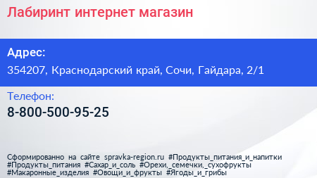 Лабиринт, интернет-магазин по адресу 354207, Краснодарский край, Сочи, Гайдара, 2/1 в дальнейшем Организация, размещена в следующих категориях: