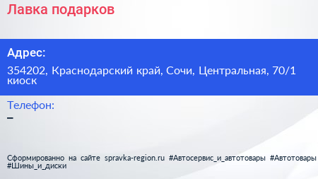 Лавка подарков по адресу 354202, Краснодарский край, Сочи, Центральная, 70/1 киоск в дальнейшем Организация, размещена в следующих категориях:
