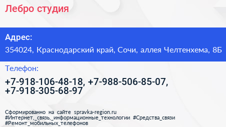 Лебро, студия по адресу 354024, Краснодарский край, Сочи, аллея Челтенхема, 8Б в дальнейшем Организация, размещена в следующих категориях: