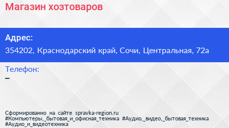 Магазин хозтоваров по адресу 354202, Краснодарский край, Сочи, Центральная, 72а в дальнейшем Организация, размещена в следующих категориях: