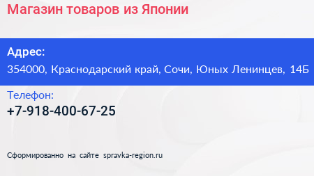 Магазин товаров из Японии по адресу 354000, Краснодарский край, Сочи, Юных Ленинцев, 14Б в дальнейшем Организация, размещена в следующих категориях: