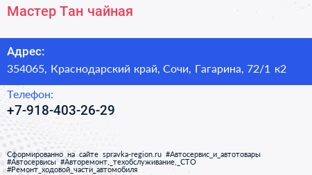 Мастер Тан, чайная по адресу 354065, Краснодарский край, Сочи, Гагарина, 72/1 к2 в дальнейшем Организация, размещена в следующих категориях: