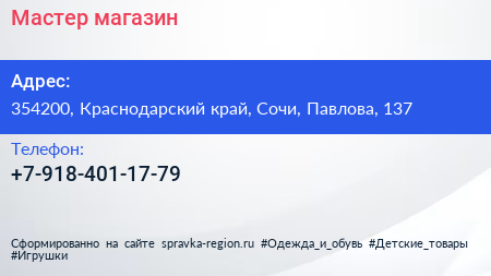 Мастер, магазин по адресу 354200, Краснодарский край, Сочи, Павлова, 137 в дальнейшем Организация, размещена в следующих категориях: