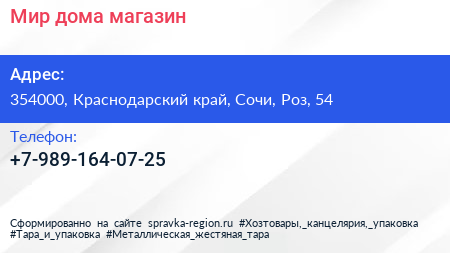 Мир дома, магазин по адресу 354000, Краснодарский край, Сочи, Роз, 54 в дальнейшем Организация, размещена в следующих категориях: