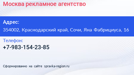 Москва, рекламное агентство по адресу 354002, Краснодарский край, Сочи, Яна Фабрициуса, 16 в дальнейшем Организация, размещена в следующих категориях: