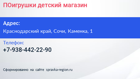 ПОигрушки, детский магазин по адресу Краснодарский край, Сочи, Каменка, 1 в дальнейшем Организация, размещена в следующих категориях: