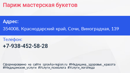 Париж, мастерская букетов по адресу 354008, Краснодарский край, Сочи, Виноградная, 139 в дальнейшем Организация, размещена в следующих категориях: