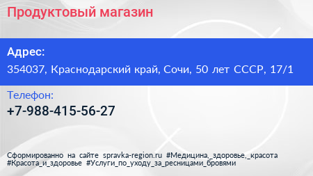 Продуктовый магазин по адресу 354037, Краснодарский край, Сочи, 50 лет СССР, 17/1 в дальнейшем Организация, размещена в следующих категориях: