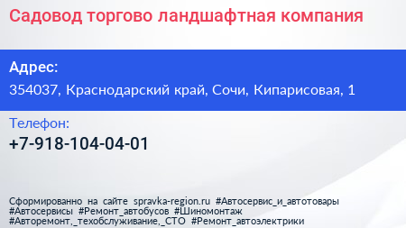 Садовод, торгово-ландшафтная компания по адресу 354037, Краснодарский край, Сочи, Кипарисовая, 1 в дальнейшем Организация, размещена в следующих категориях: