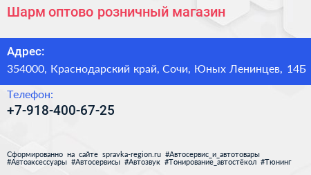 Шарм, оптово-розничный магазин по адресу 354000, Краснодарский край, Сочи, Юных Ленинцев, 14Б в дальнейшем Организация, размещена в следующих категориях: