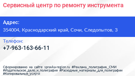 Сервисный центр по ремонту инструмента по адресу 354004, Краснодарский край, Сочи, Следопытов, 3 в дальнейшем Организация, размещена в следующих категориях: