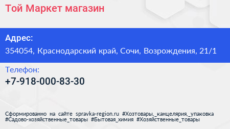 Той Маркет, магазин по адресу 354054, Краснодарский край, Сочи, Возрождения, 21/1 в дальнейшем Организация, размещена в следующих категориях: