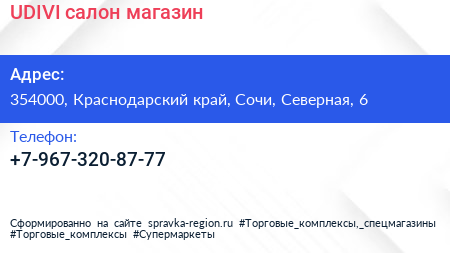 UDIVI, салон-магазин по адресу 354000, Краснодарский край, Сочи, Северная, 6 в дальнейшем Организация, размещена в следующих категориях: