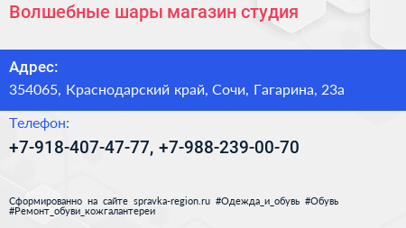 Волшебные шары, магазин-студия по адресу 354065, Краснодарский край, Сочи, Гагарина, 23а в дальнейшем Организация, размещена в следующих категориях: